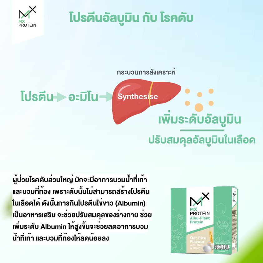 สรรพคุณของ MX Protein สูตรพืชและไข่ขาว อัลบูแพลนท์ มีดีที่ไข่ขาวและอะมิโนที่เข้มข้นกว่าพืชหลายชนิด โปรตีนไข่ขาวใน MX เด่นที่ให้โปรตีนกับร่างกายอย่างช้าๆ และต่อเนื่อง ไม่สร้างของเสียในเลือด และไม่ทำให้ตับและไตทำงานหนัก ดังนั้น ผู้ป่วยโรคไต และ โรคตับ และมะเร็ง ที่ขาดโปรตีน